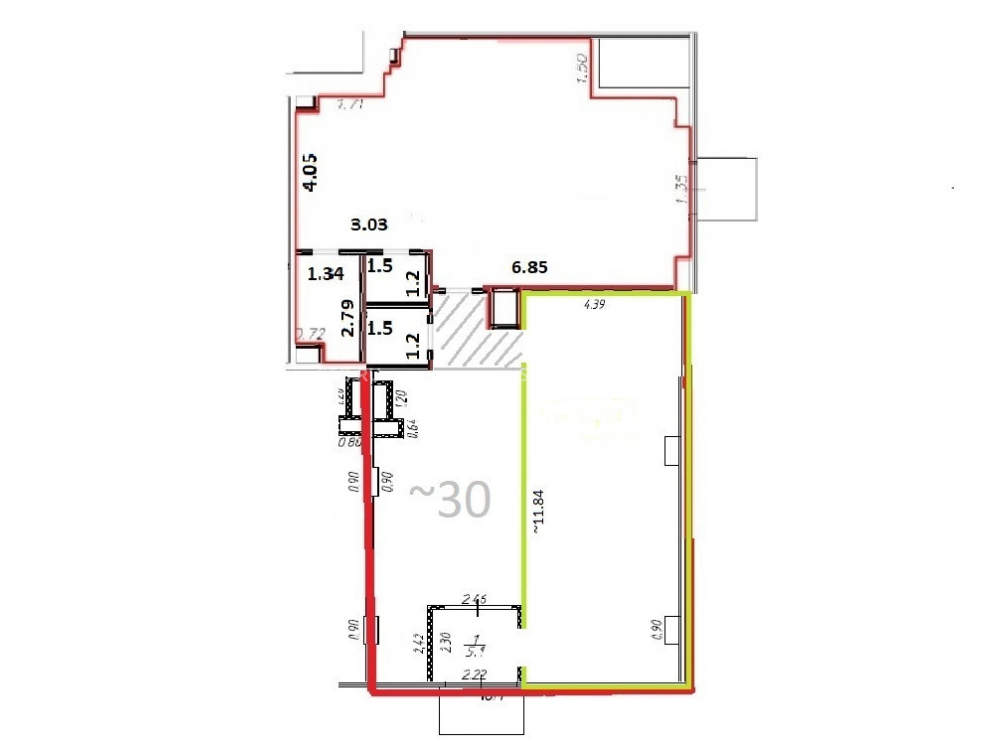 Общая площадь 30 кв.м. В помещении имеется отдельный вход. Планировка – торговый зал, 1 сан. узел. Высота потолков 4,9 м, витринные окна по фасаду. Электрическая мощность 5 кВт. Место для размещения рекламной вывески.