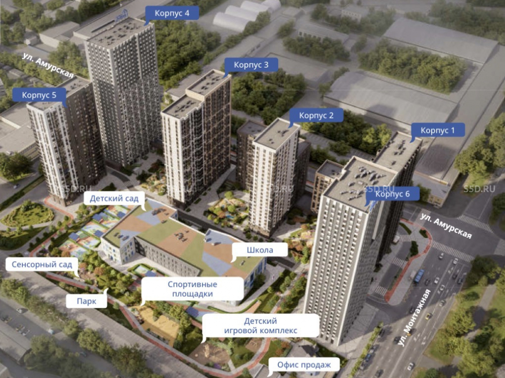 Проект включает 6 монолитных корпусов с наполнением бизнес-класса с переменной этажностью в 10-32 этажа, подземный паркинг, собственную школу и детский сад - 1912 квартир на 3074 человека.