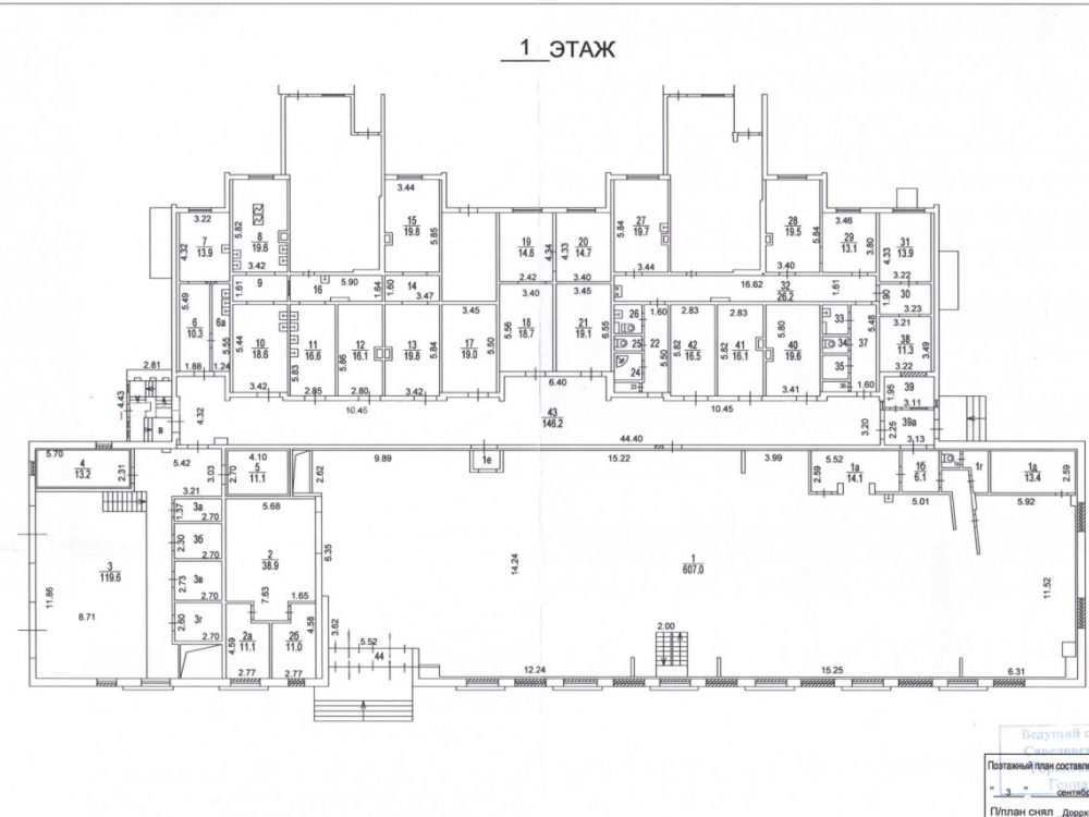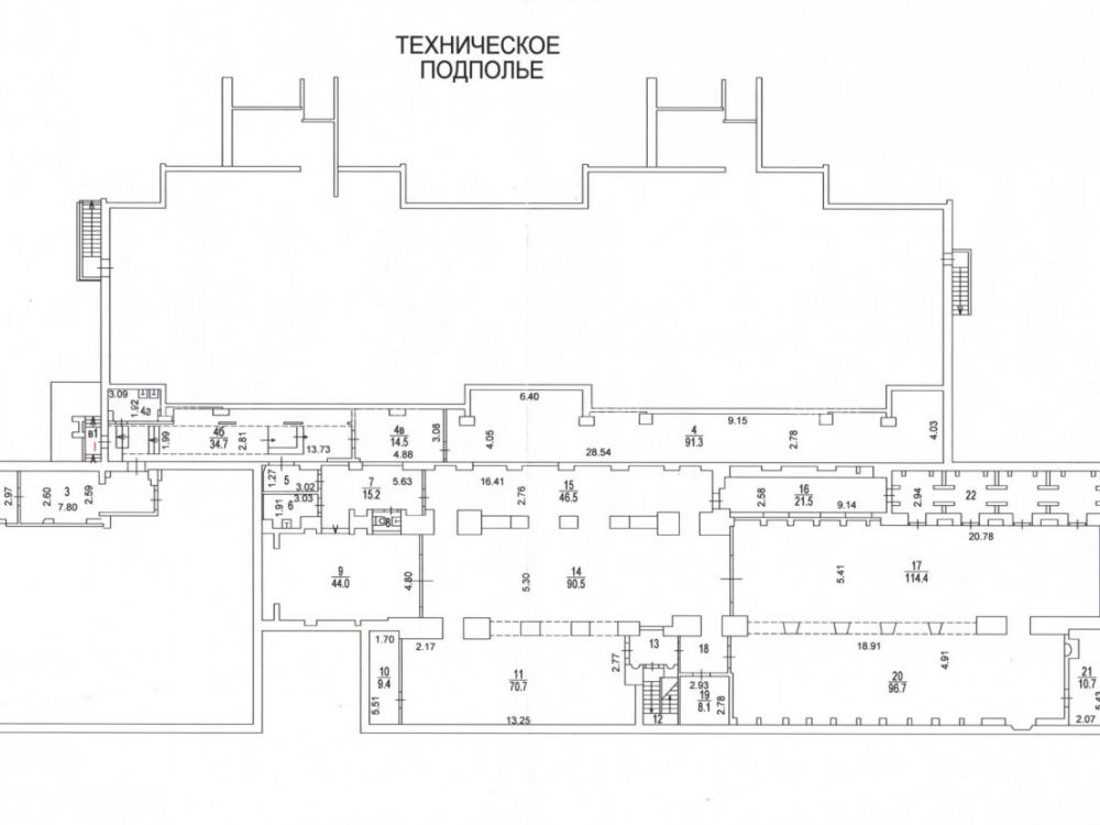 Общая площадь: 2263 кв. м, из них первый этаж: 1487 кв. м, подвал: 767 кв. м.