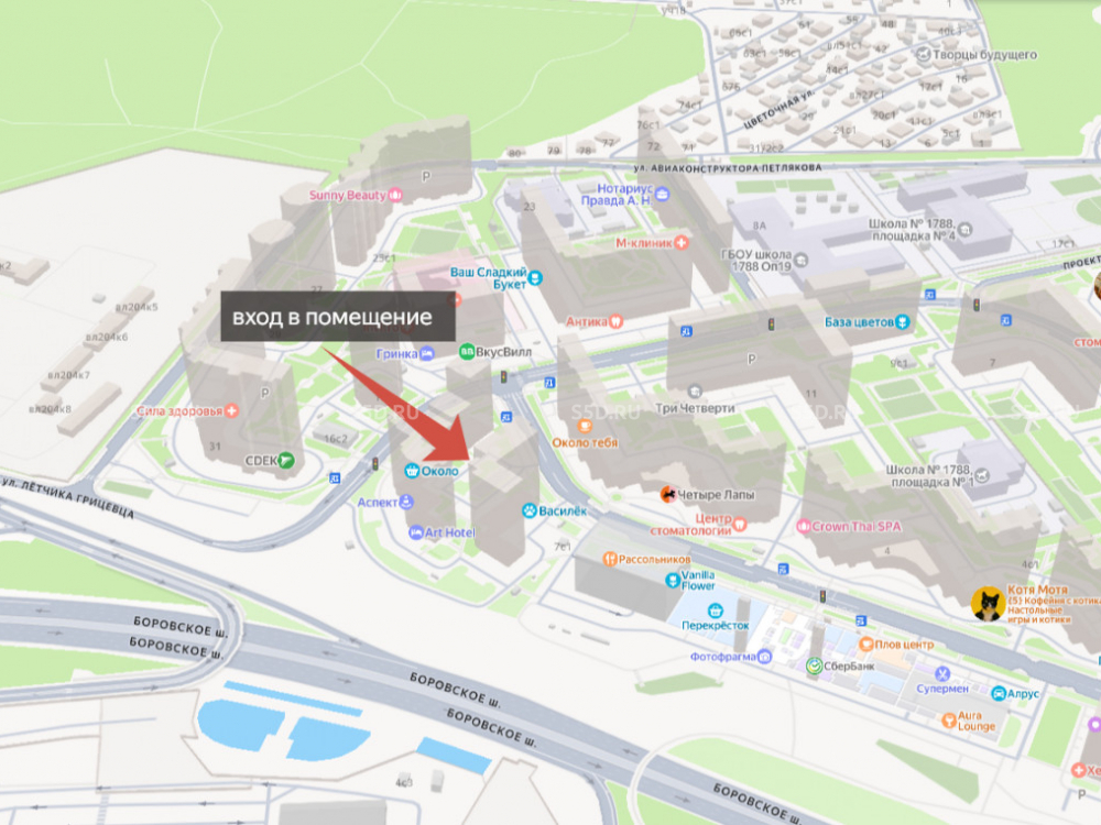 Торговое окружение: Самокат, химчистка Дарья, алкомаркет Ароматный мир, ветклиника Василёк, Красное и Белое, Перекресток и другие.