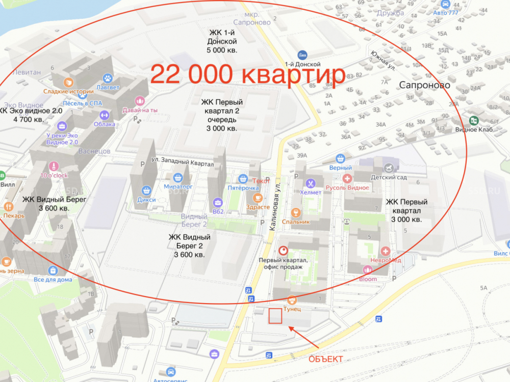 Район динамично застраивается. Улица Калиновая служит проездом в ЖК Первый Квартал 1-я и 2-я очереди, ЭКО Видное и ЭКО Видное 2.0, Видный берег и Видный берег 2, и ЖК 1-й Донской. В общей сложности порядка 22 000 квартир. Рядом находится конечная остановка общественного транспорта. Соседнее помещение занимает супермаркет Перекресток, аптека и ресторан.