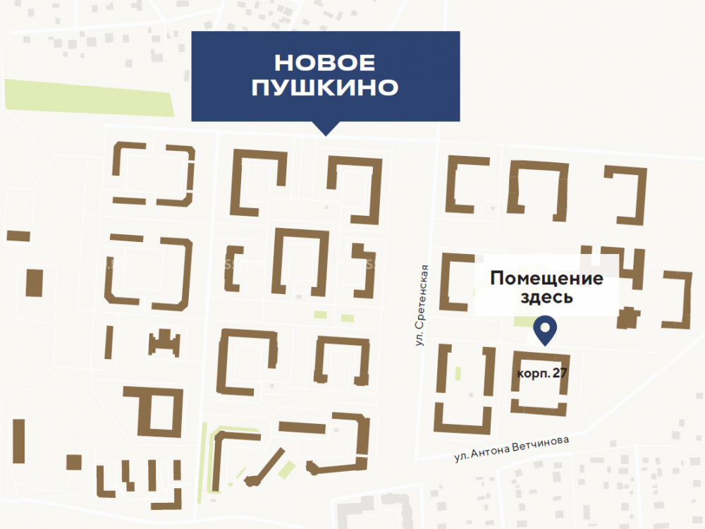 Предлагается к продаже помещение свободного назначения по адресу: МО, г.о. Пушкинский, ул. Антона Ветчинова, д. 3, корп. 1. Площадь объекта составляет 108.6 кв.м. Площадь располагается в 27-ом корпусе, всего ЖК включает в себя 44 дома. Окна объекта выходят на улицу, на проезжую и пешеходную часть, как раз по пути людей в школу и детский сад.
