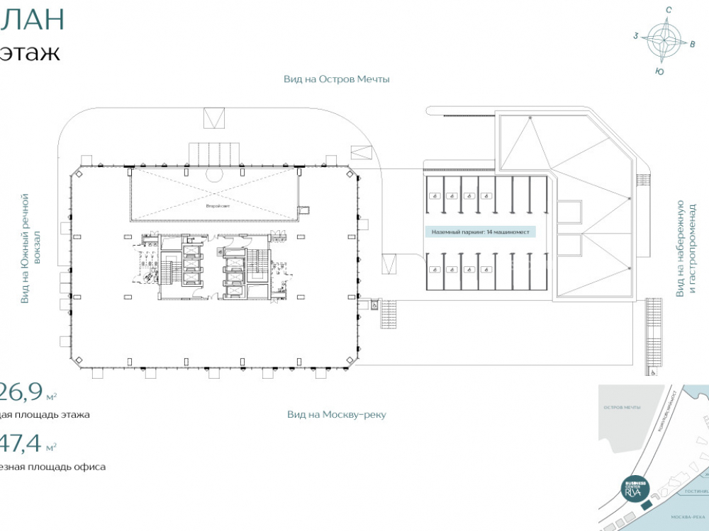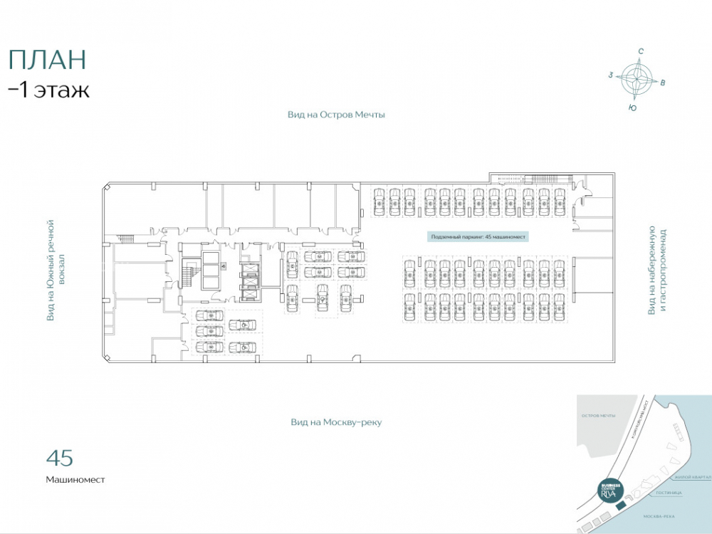 Парковка: 45 м/м в подземном паркинге и 14 м/м на наземном