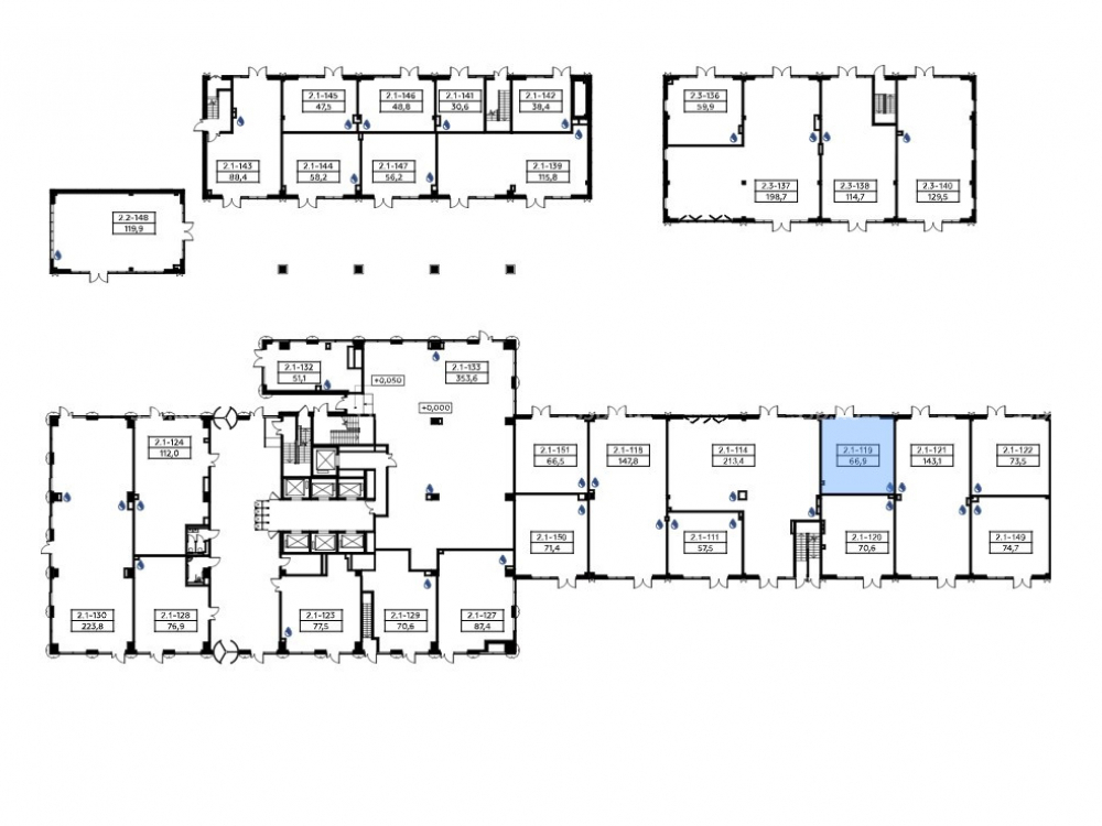 На первых этажах - дизайнерские лобби с зонами ресепшен, лаунж-зонами, а также кафе, магазины и сервисные службы;