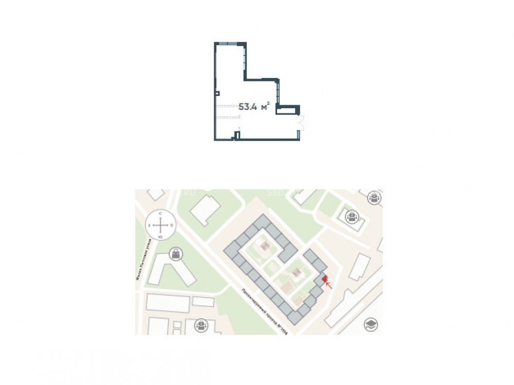1 этаж 19-этажного жилого дома, общая площадь 53.4 кв.м.