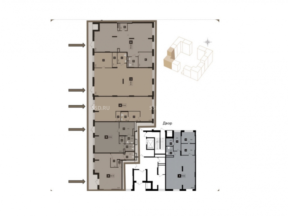 Угловое помещение общей площадью 431.3 кв.м., 5 отдельных входов с фасада. Витринные окна на две стороны. Высота потолков – 4.6 м. Парковка: перед фасадом. Мощность электроэнергии - 86 кВт. Объект угловой, расположен на 1-й линии въезда в ЖК.