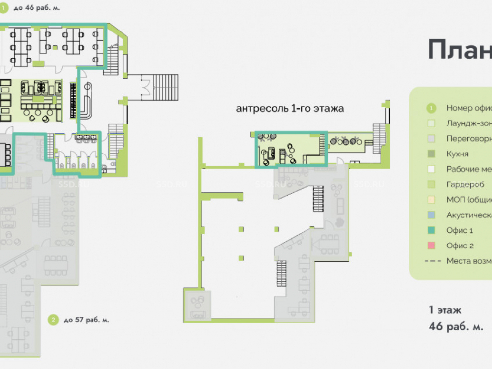 Просторная зона на 46 рабочих мест с круглосуточным доступом.