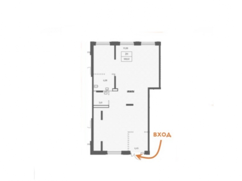 1-ый этаж 13-ти этажного жилого дома. Помещение площадью - 108 кв.м, отдельный вход с улицы. Высота потолков - 4 м, электрическая мощность по запросу. Центральные коммуникации. Витринное остекление, размещение рекламной вывески на фасаде.