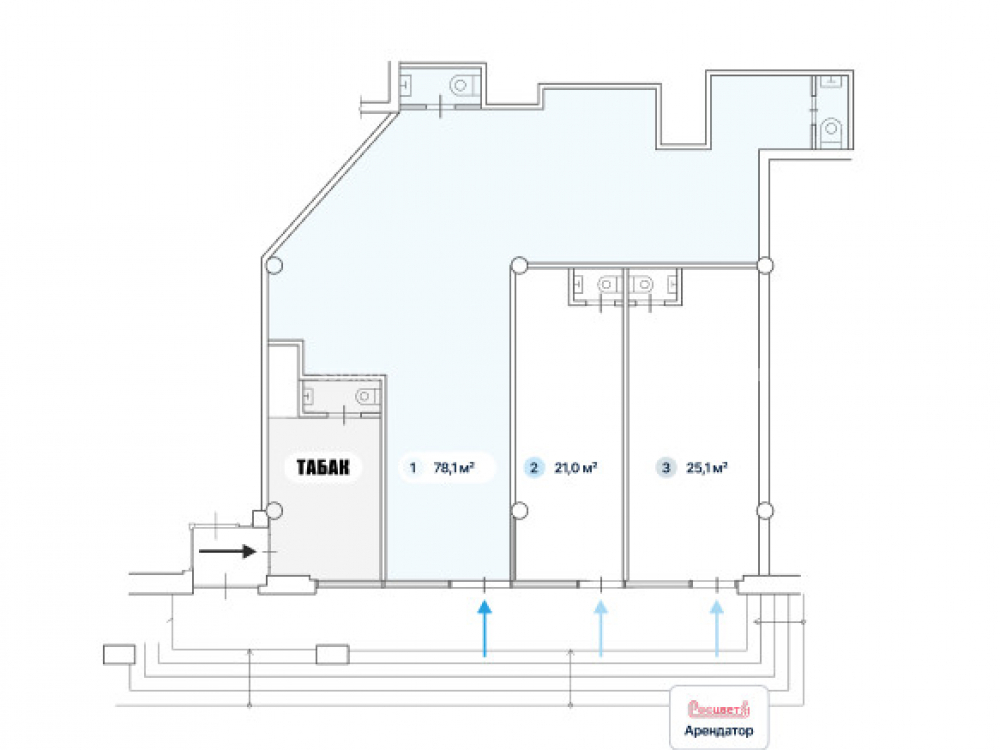 1 этаж с отдельным входом с улицы, общая площадь -78.1., отделка от прошлого арендатора. Планировка — открытая (свободная). Все городские инженерные коммуникации, электричество по запросу под любой вид деятельности.