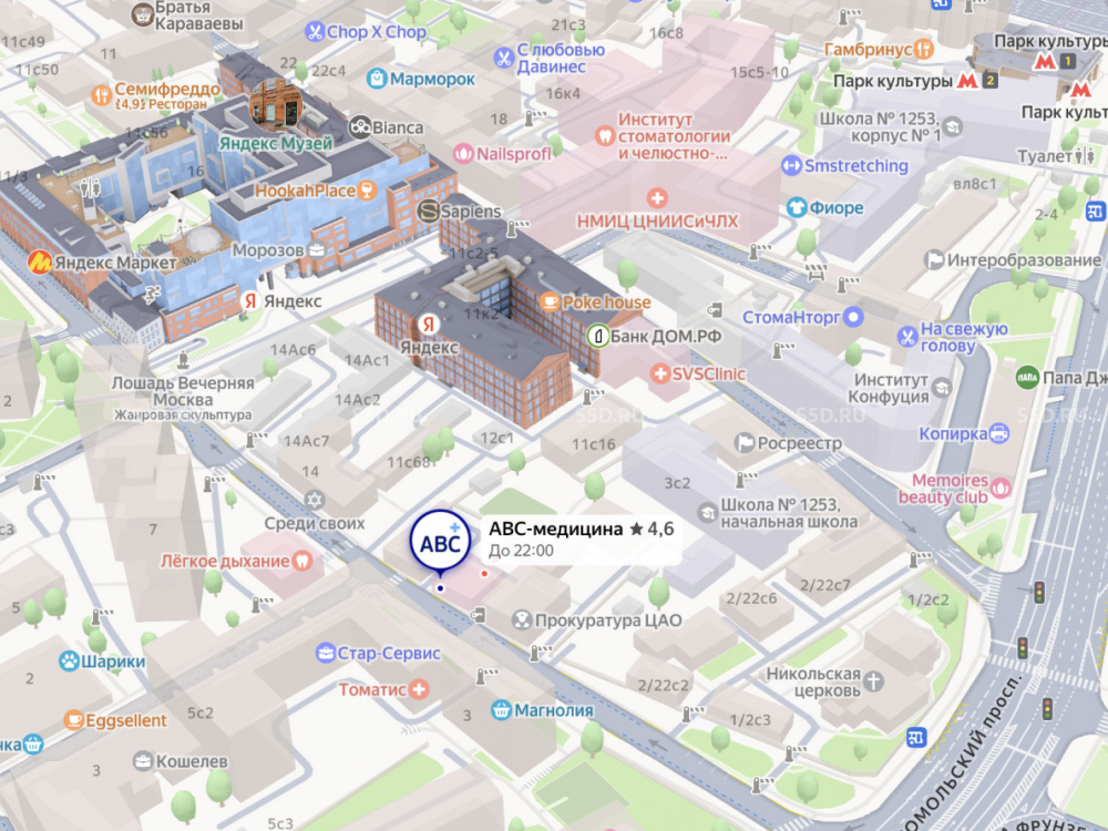 Продажа здания с арендатором: клиника ABC-медицина в Хамовниках. Первая линия домов улицы Льва Толстого. 5 минут пешком от метро Парк культуры. Здание построено в 1841 году.
