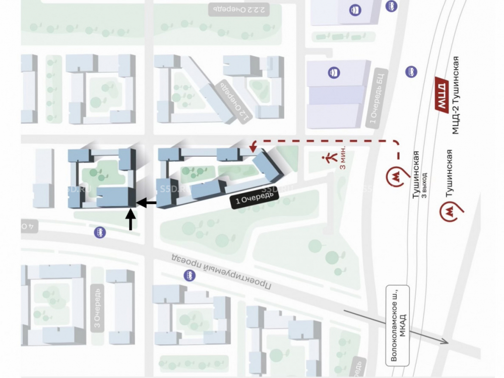 3 минуты от станции метро Тушинская. 6 минут от Волоколамского шоссе. 8 минут от МКАДа.