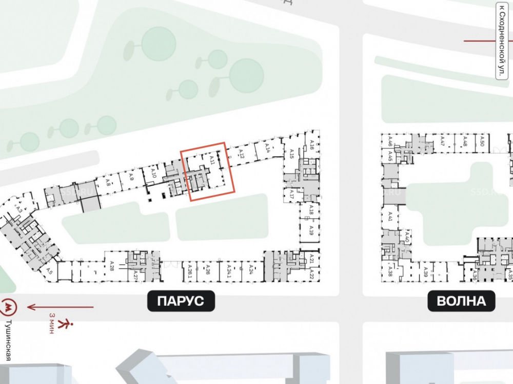 3 минуты от станции метро Тушинская. 6 минут от Волоколамского шоссе. 8 минут от МКАДа.
