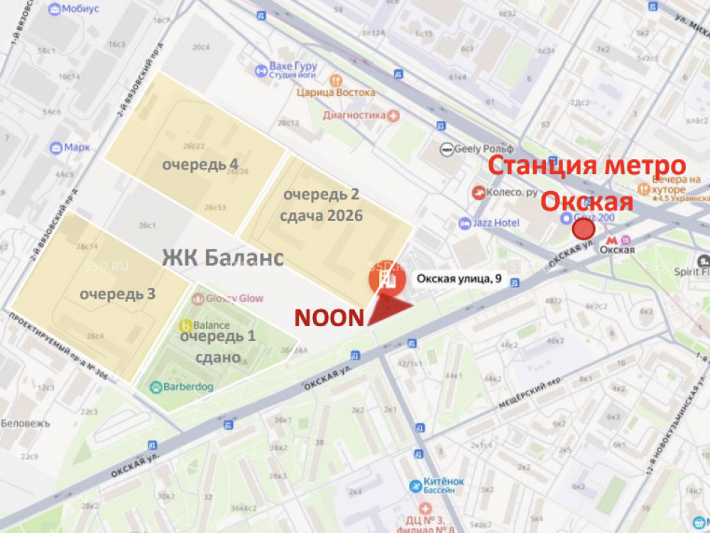 Аренда помещения свободного назначения в бизнец-центре класса B+ "Noon". Ввод в эксплуатацию в 2026 году. Первая линия домов улицы Окская. 5 минут пешком до станции метро "Окская". В непосредственной близости находится ЖК "Баланс". Первая очередь сдана и заселена, вторая очередь сдается в 2026 году.