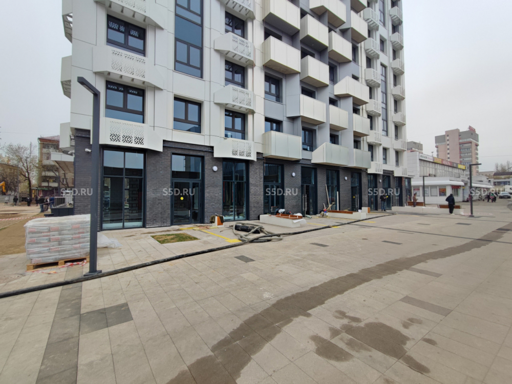 Технические характеристики: общая площадь 105 м2, располагается на 1 этаже 23-х этажного жилого дома 2025 года постройки, открытая планировка, высота потолка — 4.5 м, витринные окна на две стороны.