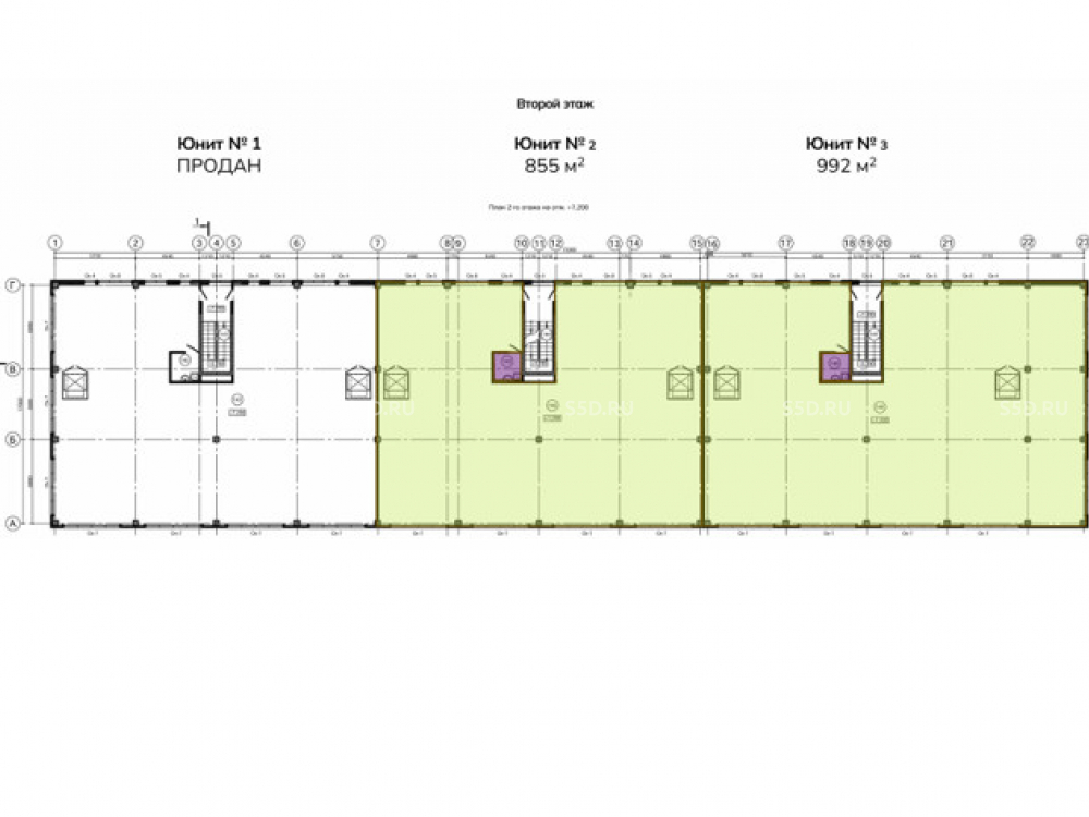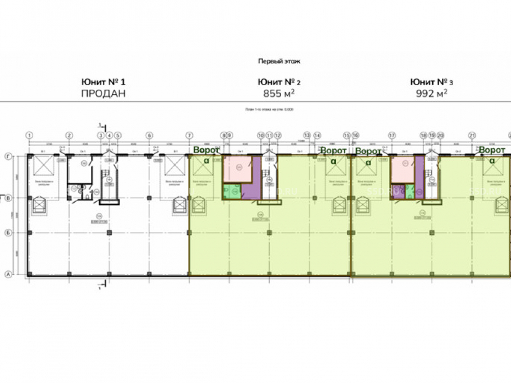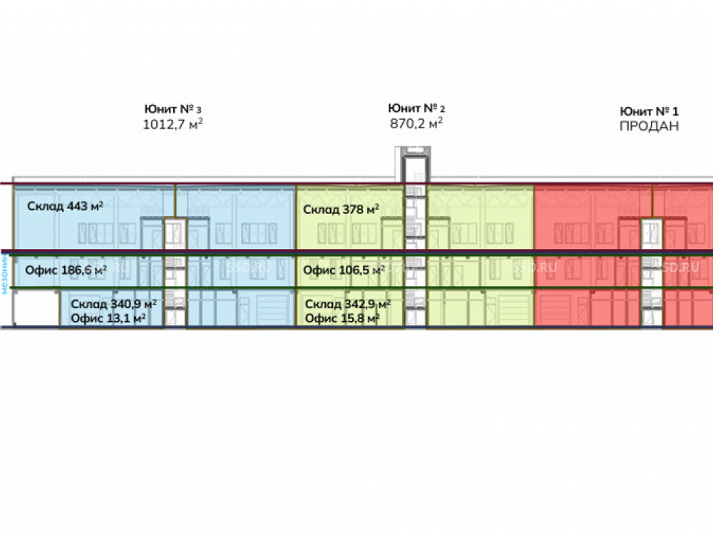 • Общая площадь склада: 1882,9 м² (склад + мезонин +офис), состоящая из 2 юнитов (есть возможность приобрести по отдельности).