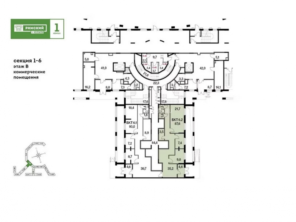 ЖК состоит из 5 монолитных многосекционных корпусов переменной этажности на 7 000 квартир. Помещение расположено на центральной прогулочной аллее с фонтаном. Дом заселен, все квартиры сдавались с отделкой.