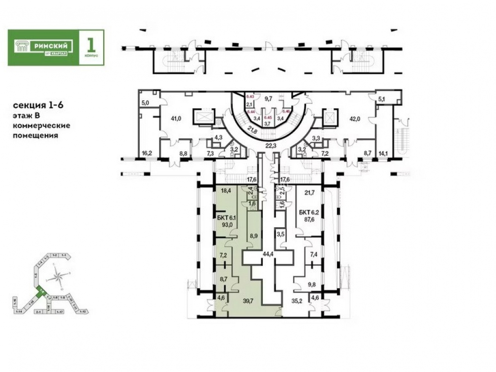 ЖК состоит из 5 монолитных многосекционных корпусов переменной этажности на 7 000 квартир. Помещение расположено на центральной прогулочной аллее с фонтаном. Дом заселен, все квартиры сдавались с отделкой.