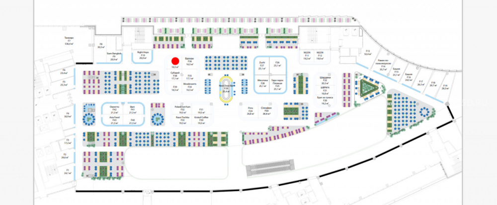 Торговое окружение: Кухни мира, мармелад, бутики одежды, спортивное питание