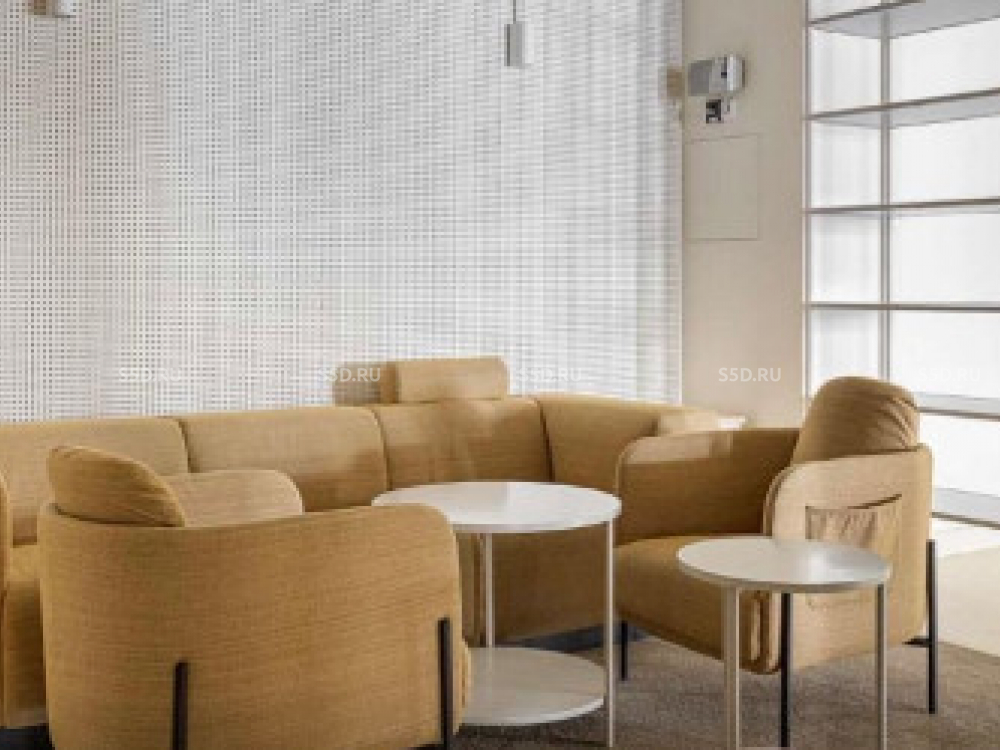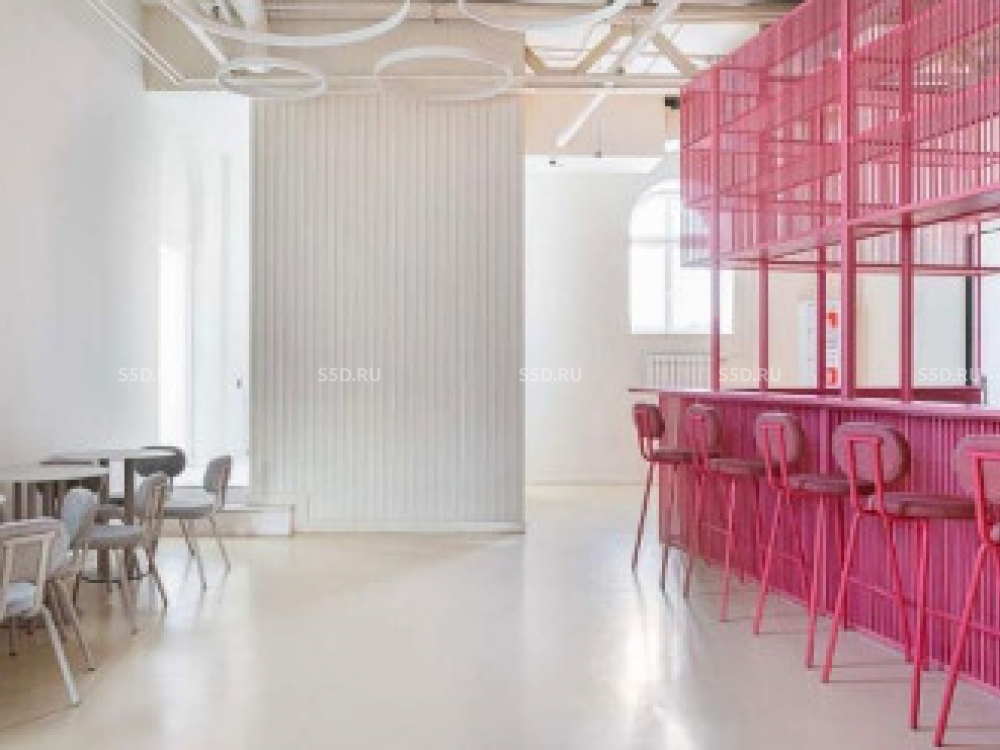 На первом этаже входная группа с зоной ресепшн, кафетерий, переговорная и гостевые санузлы.