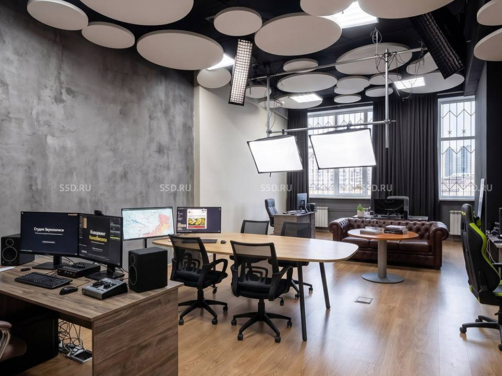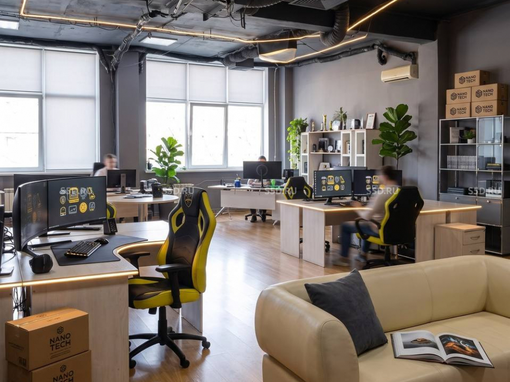Планировка: Функциональное пространство, включающее общий зал, переговорную комнату, рабочий зал, кабинеты и серверную.