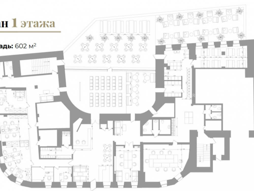 Внутренний двор (веранда) под открытом небом площадью 200 кв.м. позволяет собирать до 100 человек при проведении фуршета.