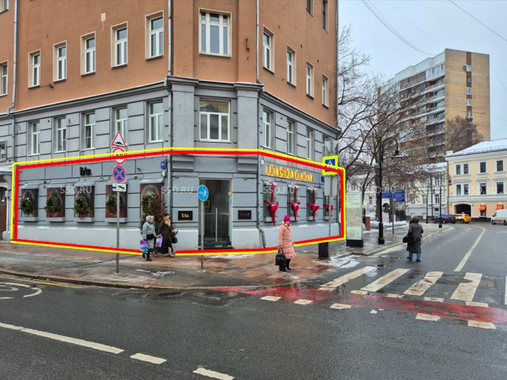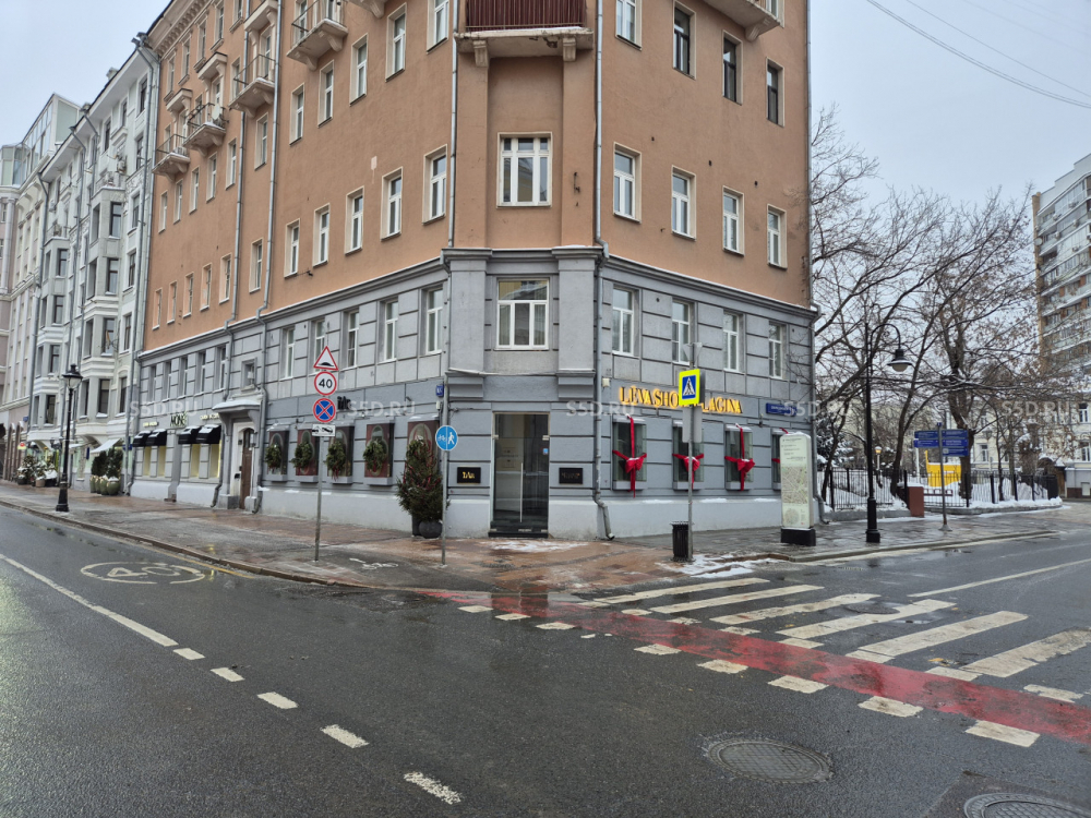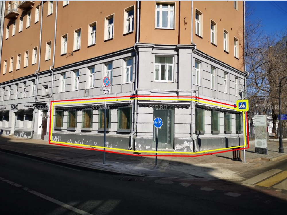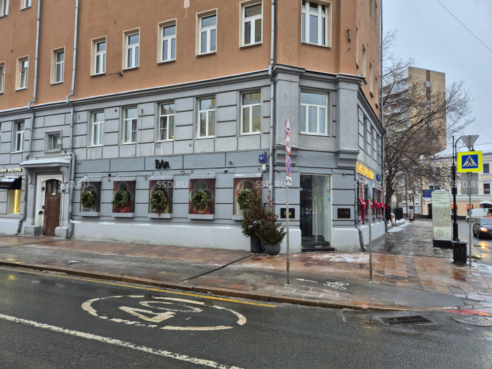 Помещение расположено на пересечении ул. Малая Никитская и ул. Спиридоновка - угловое помещение на первом этаже 6-этажного жилого дома 1908 года постройки. Умеренный постоянный трафик, хорошая визуализация, высокий рекламный потенциал.