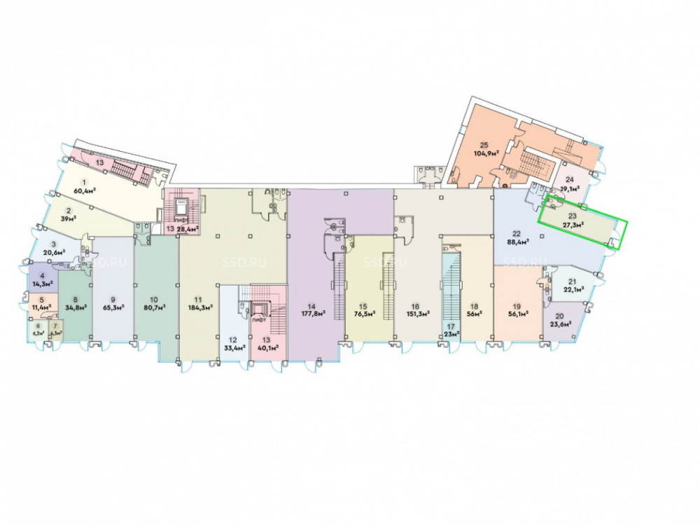 Общая площадь - 27.3 кв. м. Расположено на 1-ом этаже встроенно-пристроенного помещения общей площадью 2 400 кв. м.