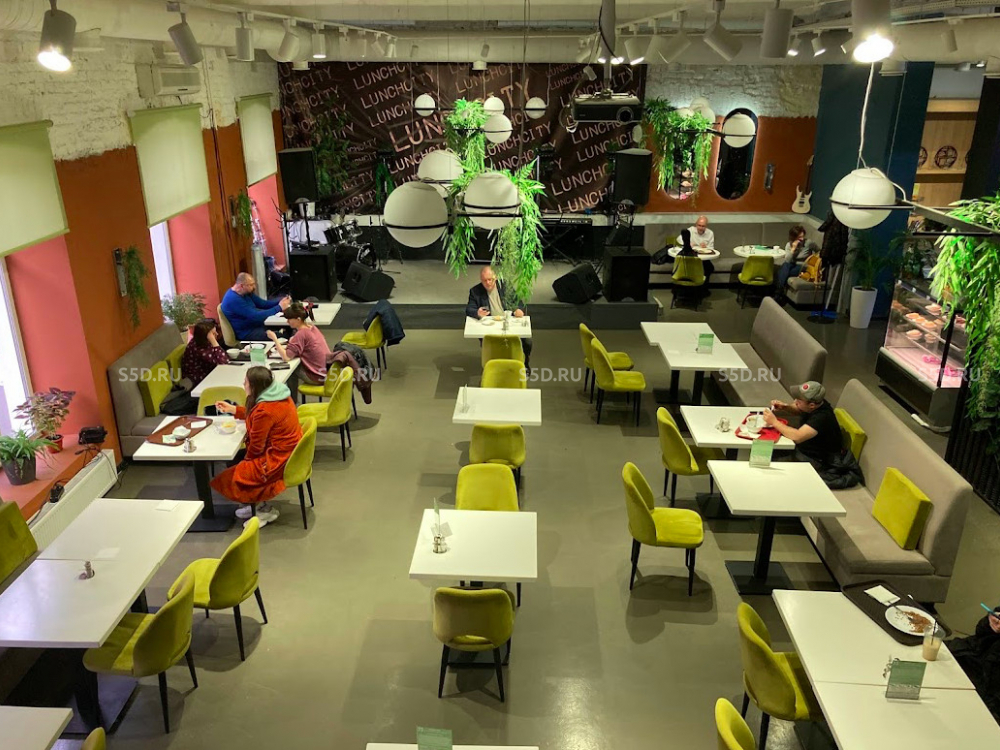 Зона приема пищи (первый и антресольный этаж), небольшая сцена для проведения мероприятий, кухня и технические помещения.