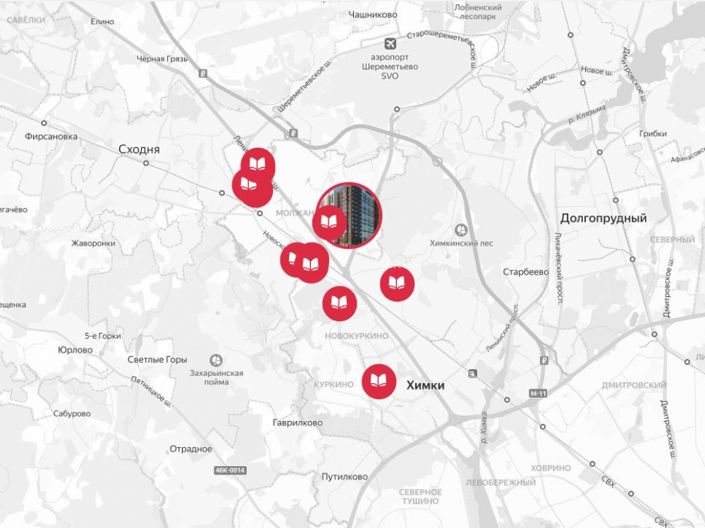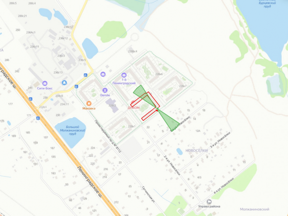 Прямой выезд от комплекса ведет на Ленинградское шоссе. В 1 км от разворота в сторону центра.