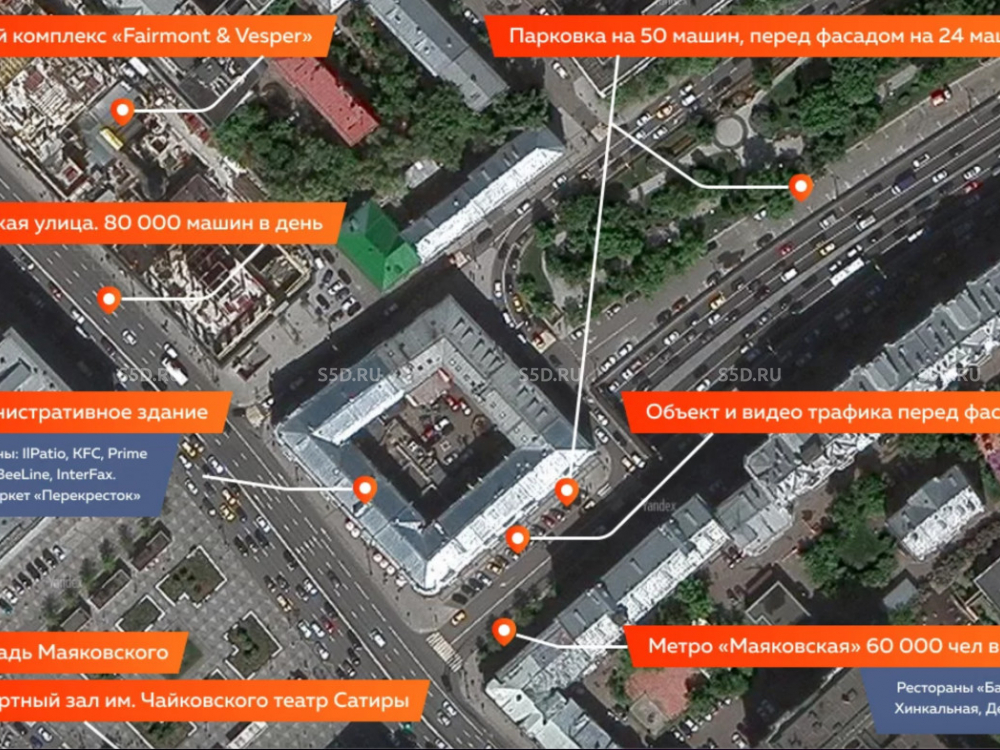 от станции метро "Маяковская", на пересечении улицы Тверской и Садового кольца. Сверх интенсивный пешеходный и автомобильный