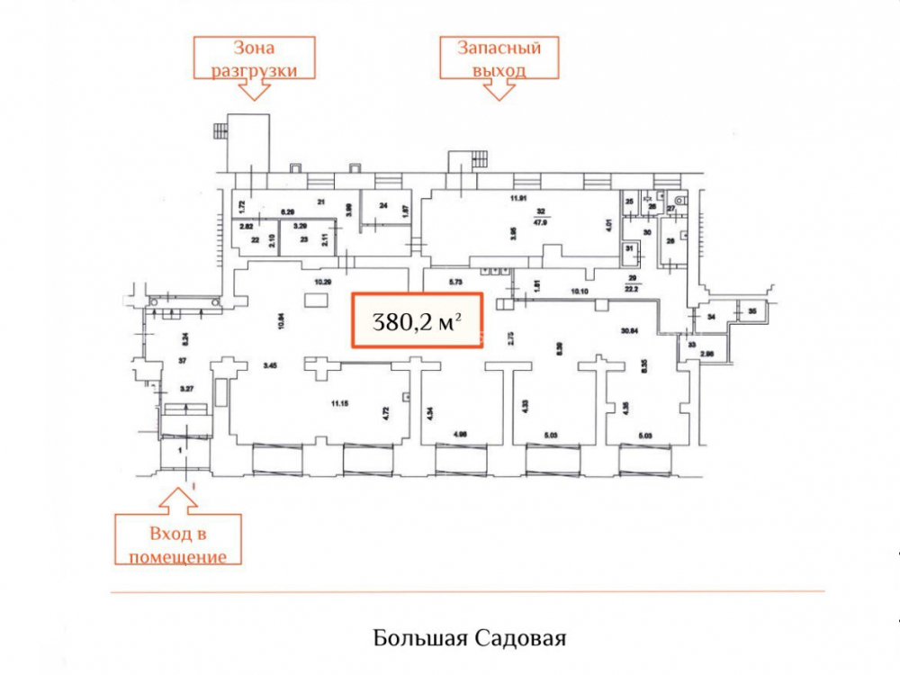 Общая площадь 380 кв.м., 1 этаж, количество входво - 3, один из которыз со стороны Большой Садовой.