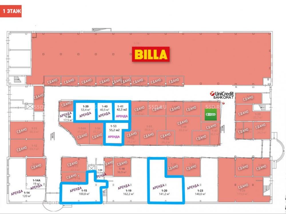 Первый этаж торгового центра "Лавка". Площадь: 141,2 м². Высота потолка: 4,5 метра. Подведены все необходимые коммуникации: водоснабжение, канализация, отопление. Оборудована система центрального кондиционирования и приточно-вытяжной вентиляции.