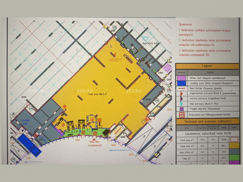 Общая площадь торговой площади - 1165,2 кв.м. Высота потолков - 4,5 кв.м. Свободная планировка.