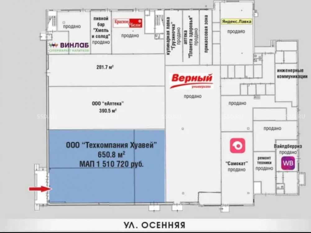 ПСН в ОСЗ; общая площадь - 650.8 кв.м.; два отдельных входа с фасада; сложившийся жилой массив; выделенная мощность - 30 кВт ; хороший рекламный потенциал. ЗУ в долгосрочной аренде.