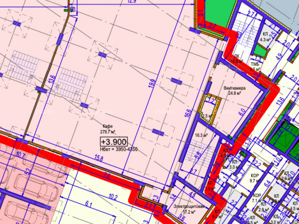 Стилобатная часть, общая площадь 630 м, 1 этаж - 315 м2; 2 этаж - 315 м2. Собственная, независимая от общедомовой, вытяжка. Высокие потолки, окна в пол, три входные группы. Своя зона разгрузки со стороны паркинга Количество электроэнергии 115 кВт.