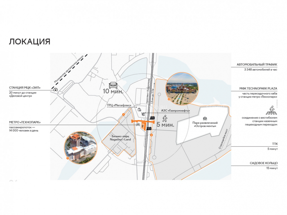 Уникальная особенность проекта - прямой доступ из метро в здание через пешеходный переход соединяющий станцию метро Технопарк и ТРЦ «Остров Мечты». без выхода на улицу.