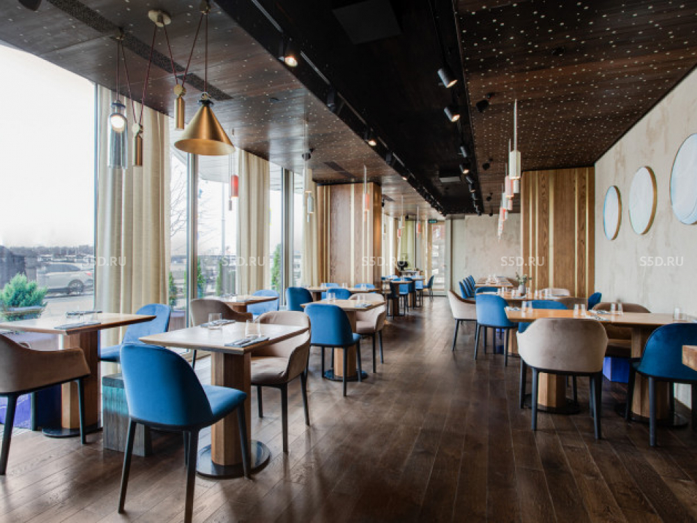 Выполнен дизайнерский ремонт под ресторан с использованием отделочных материалов премиальных брендов, оборудована барная зона, имеется дровяная печь, современная кухня с бытовой техникой и холодильниками.