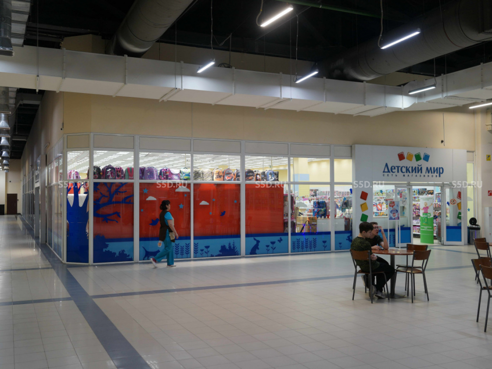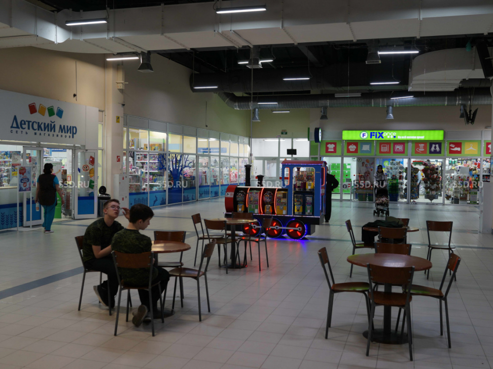 Торговое окружение: зона после фудкорта и кинотеатра. Рядом находятся магазины Детский мир, Фикспрайс и детская игровая зона.