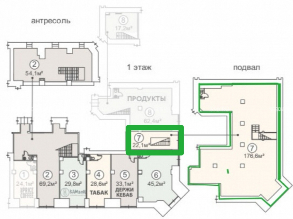 Общая площадь 198.7 кв метров. Первый этаж 22 кв метра, подвал 176,6 кв.м. Высота потолков в подвале 2,9 метра, высота потолков на первом этаже 6,1 метра. Городские коммуникации. Электроэнергия 15 кВт. Место для размещения вывески на фасаде.
