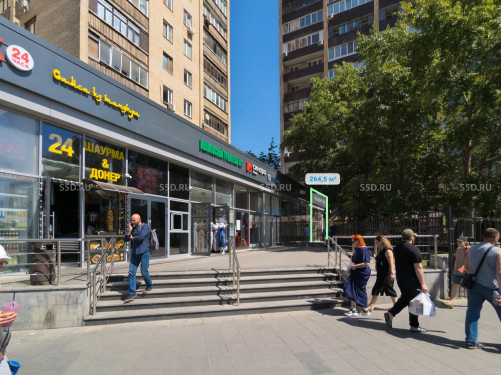 1 этаж встроенно-пристроенной части 15-этажного жилого дома, общая площадь 264.5 м2, отдельный вход, высота потолков 4.7 м2.