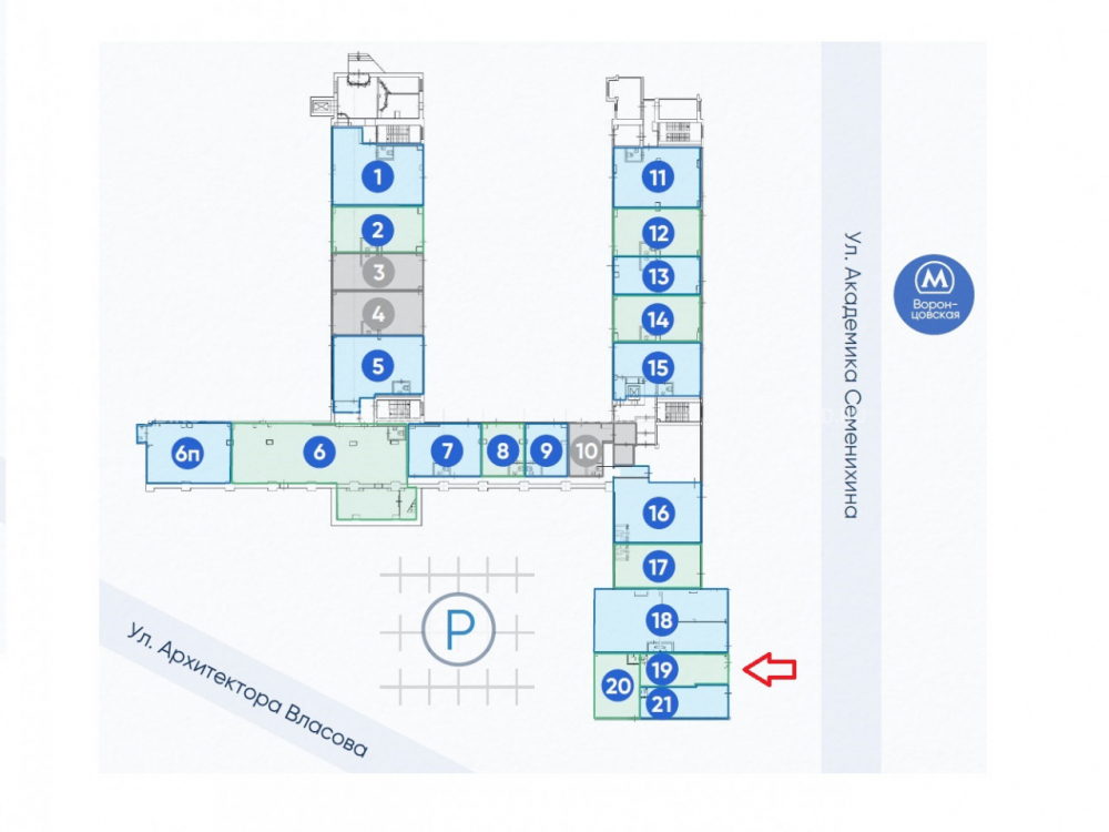 9-ти этажное здание, общей площадью 24 978,6 кв. м., построенное в 1965 году. Площадь помещения – 97, 3 кв. м., (блок №19 выходит в сторону метро Воронцовская и на ул. Академика Семенихина), 1 этаж. Отдельный вход. Большие панорамные окна. Высота потолков – 3 м. Электрическая мощность – по запросу. Свободная планировка. Мокрая точка. Установлена приточно – вытяжная вентиляция и система центрального отопления. Центральное кондиционирование. Спринклерная система пожаротушения. 4 лифта. На территории БЦ оборудована круглосуточная охраняемая парковка с пропускной системой.