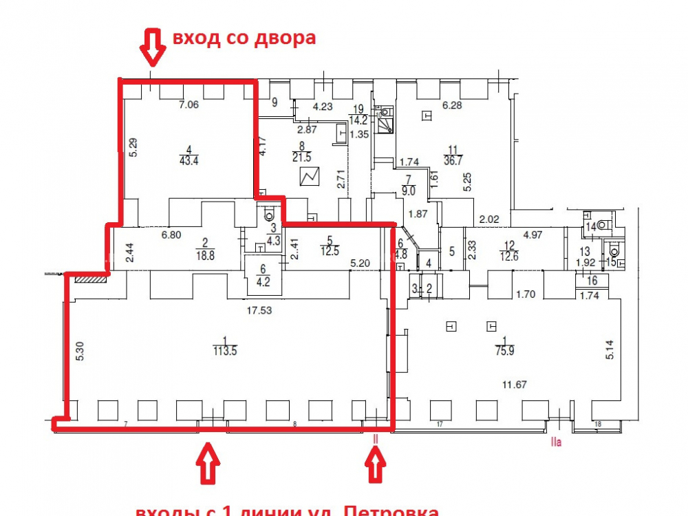 Над помещением располагаются 4 этажа апартаментов. 3 отдельных входа (2 с улицы, один со двора, для разгрузки-погрузки).