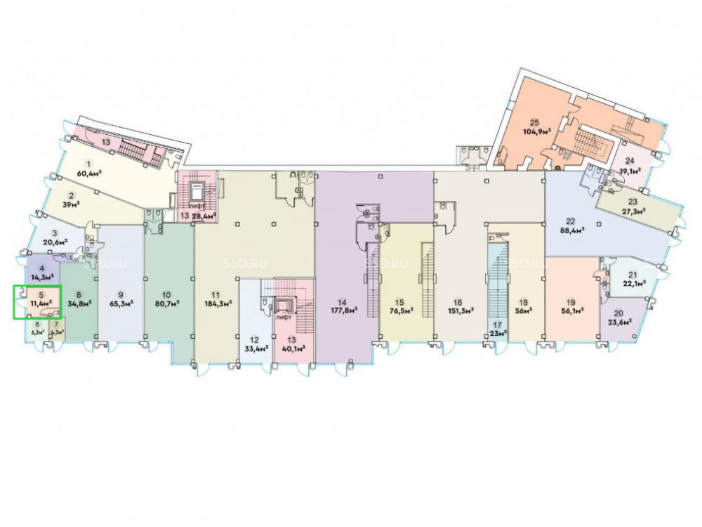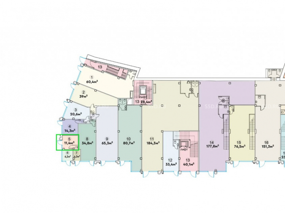 Общая площадь - 11,4 кв. м. Расположено на 1-ом этаже встроенно-пристроенного помещения общей площадью 2 400 кв. м.