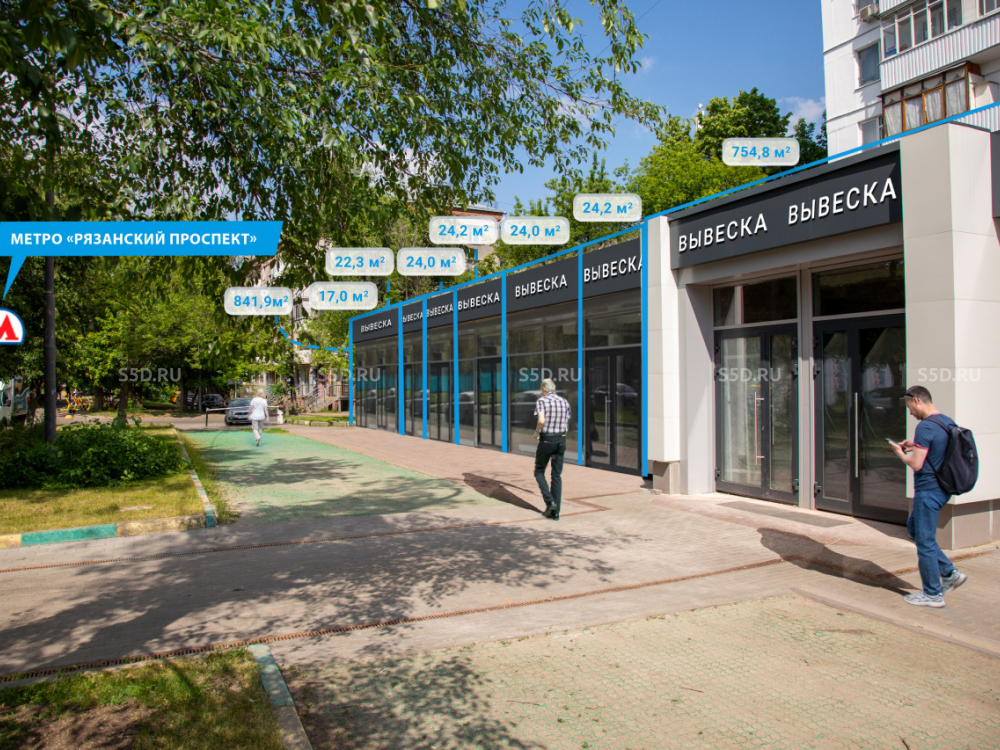 Помещение находится в 80 метрах от станции метро "Рязанский проспект" - менее 1 минуты пешком, в густонаселенном районе Москвы со сложившейся инфраструктурой. Интенсивный пешеходный трафик, плотный жилой массив.