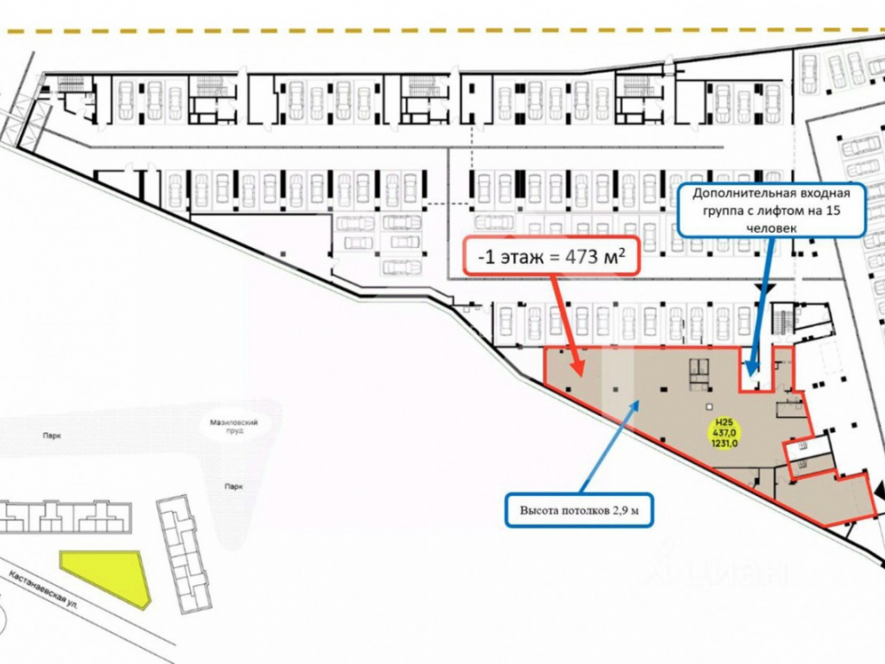 Общая площадь: 2024.8 м2 (1231 м2 с распределением: 1эт - 758м2 + цокольный - 473 м2 и 2й этаж 793.8м2), ОСЗ на первой линии, у остановки общественного транспорта и пешеходного перехода - отличная визуализация. Высота потолков 4,1 метр, 4 отдельных входа с фасада, выделенная мощность 300 кВт. Витринные окна в пол. Все городские коммуникации.