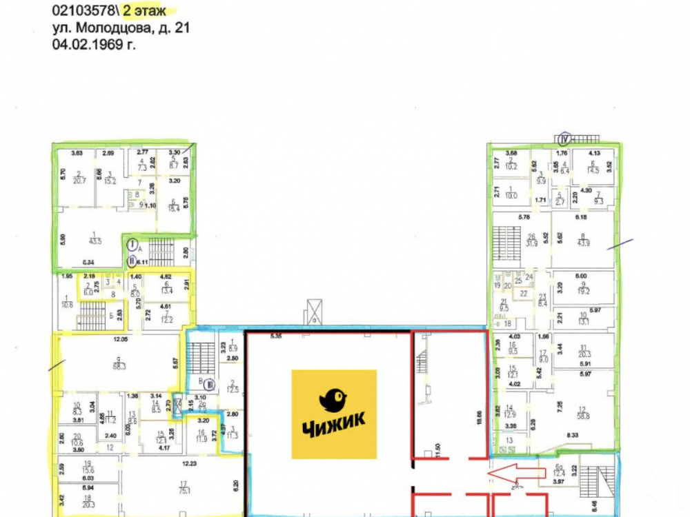 Москва, СВАО, р-н Южное Медведково, ул. Молодцова, 21, площадью 409 м2. ГАБ, МАП 500 000 рублей, арендатор - Чижик.
