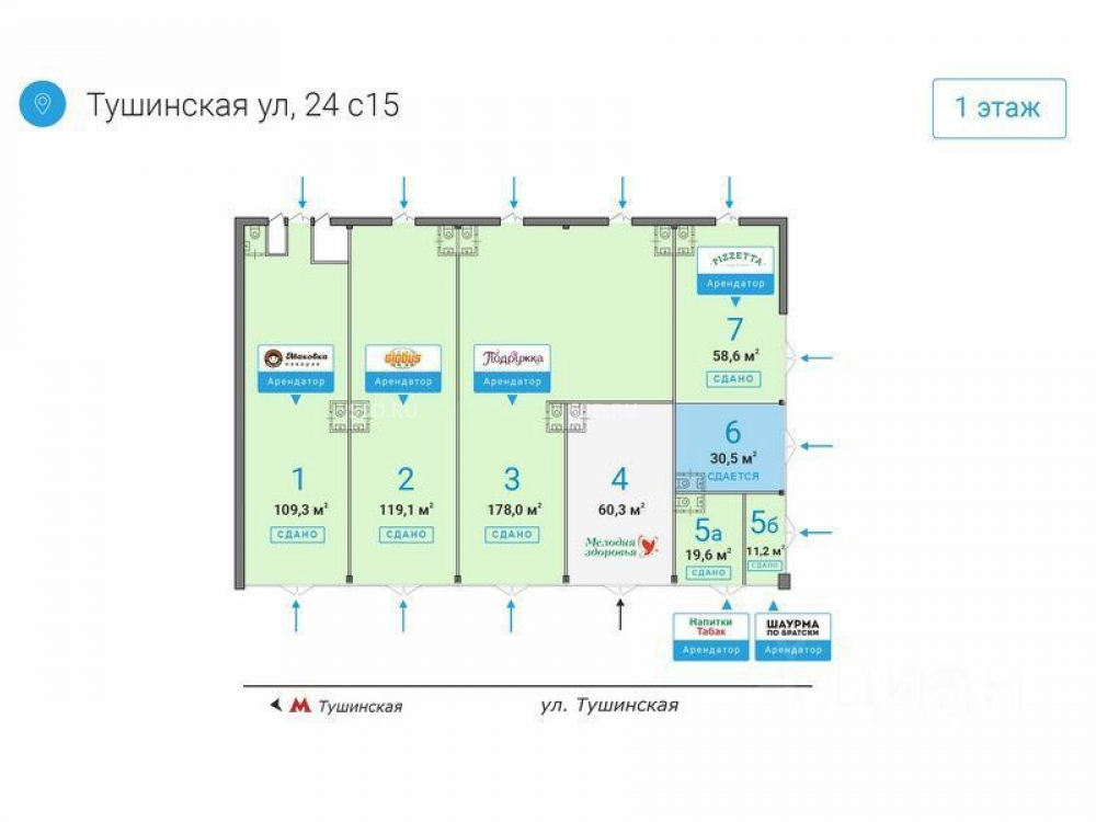 Расположение: метро и МЦД Тушинская, менее 1 минуты пешком, в крупном сложившемся жилом районе с высокой плотностью застройки и развитой инфраструктурой, на первой линии, с отдельным входом, проходное место с большим пешеходным трафиком.