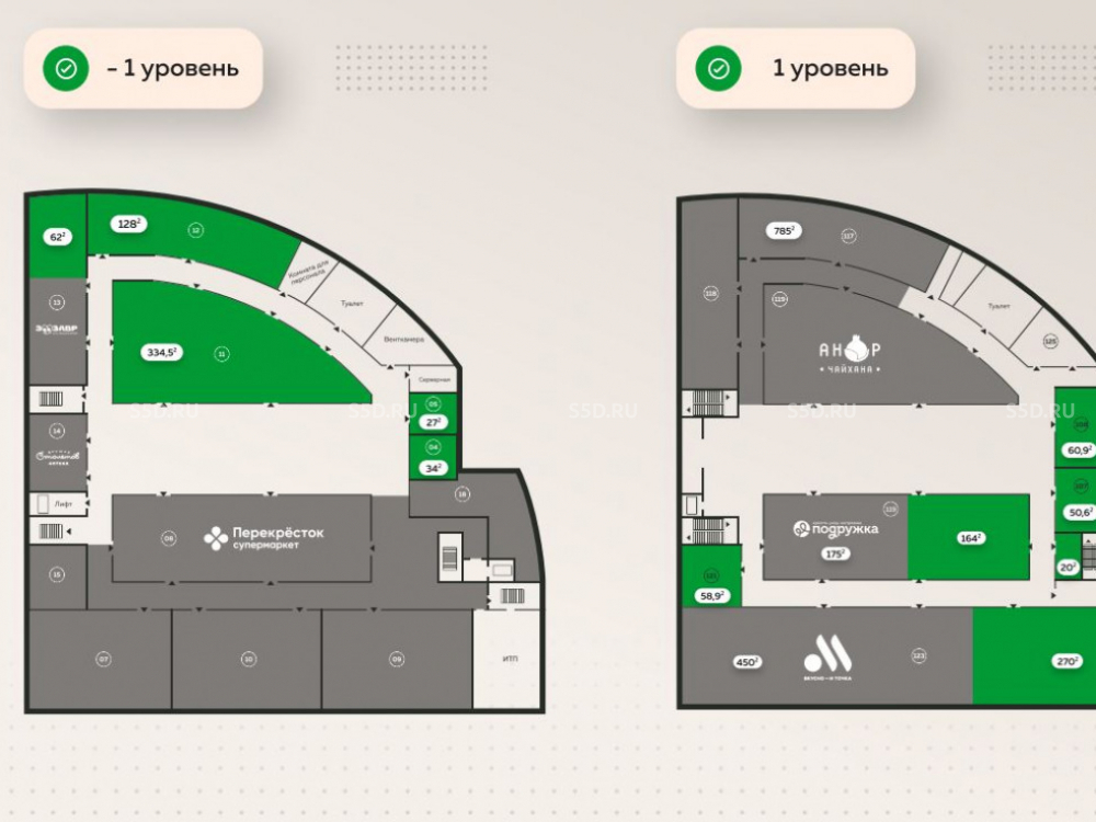 Общая площадь торгового центра 6700м2. Площадь помещения - 500м2; цокольный этаж. Высота потолка - 5,5м; Паркинг на 54м/м, грузовой лифт, панорамный лифт. Электрическая мощность по запросу.