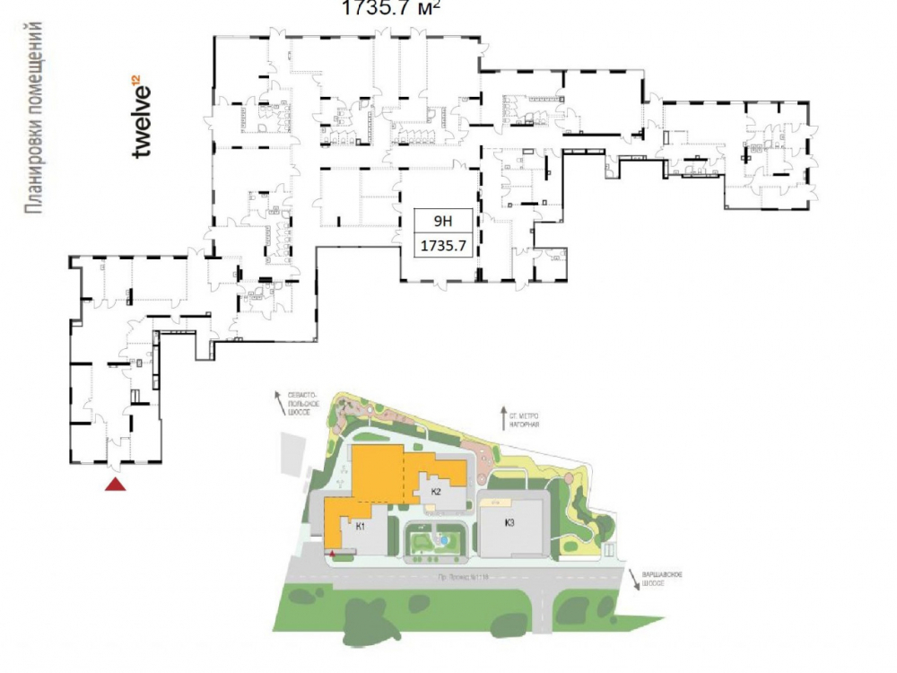 Продажа помещения свободного назначения в ЖК бизнес-класса Twelve 12 по адресу: Москва, Электролитный проезд, 5Бк2, площадью 1735.7 кв.м. В составе комплекса будет возведено 3 корпуса высотой 22-28-34 этажа на 934 квартиры и 9 коммерческих помещений. Ближайшая ст. метро Нагорная 5 мин. пешком.
