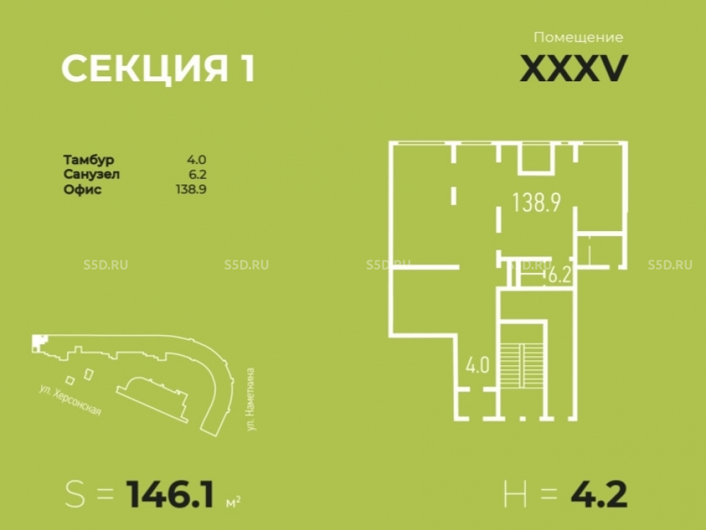 Общая площадь – 146,1 кв. м., 1 этаж. Отдельный вход. Панорамное остекление. Высокие потолки до 4.2 м – больше света и простора в помещениях. Электрическая мощность – по запросу. Отделка shell & core. Подведены все коммуникации. Охраняемая территория. Круглосуточное видеонаблюдение, вход и въезд по пропускам. Подземный паркинг.